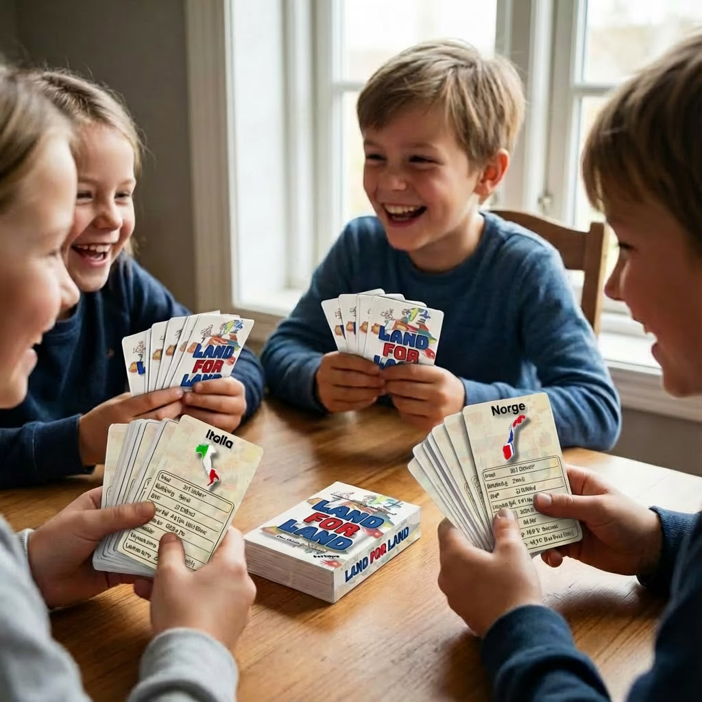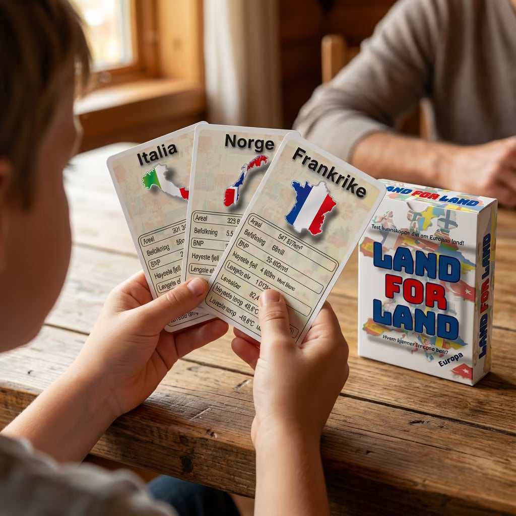 Land for land gjør geografi til lek. Barna lærer om Europas land helt uten pugging, mens dere har det gøy sammen rundt bordet.